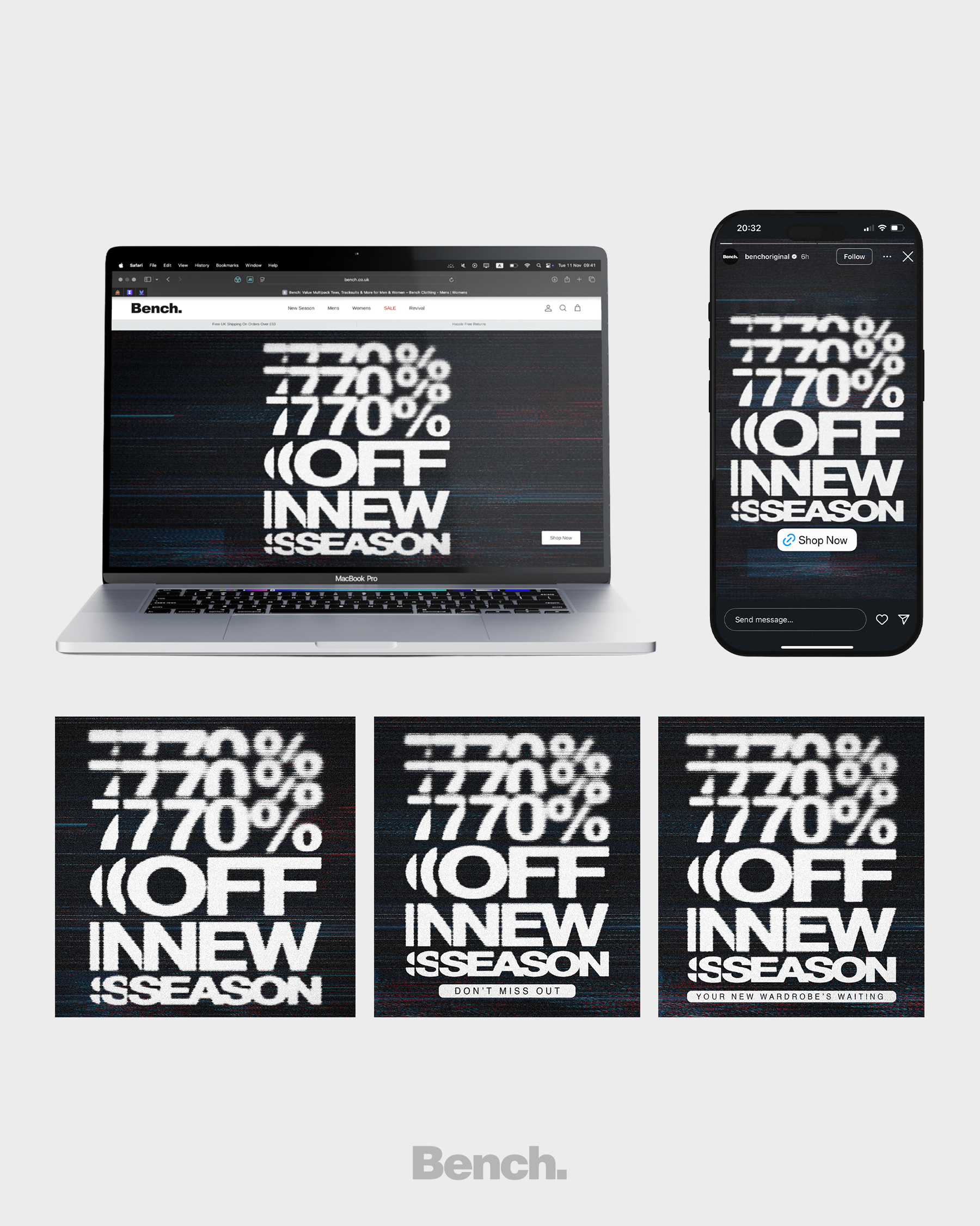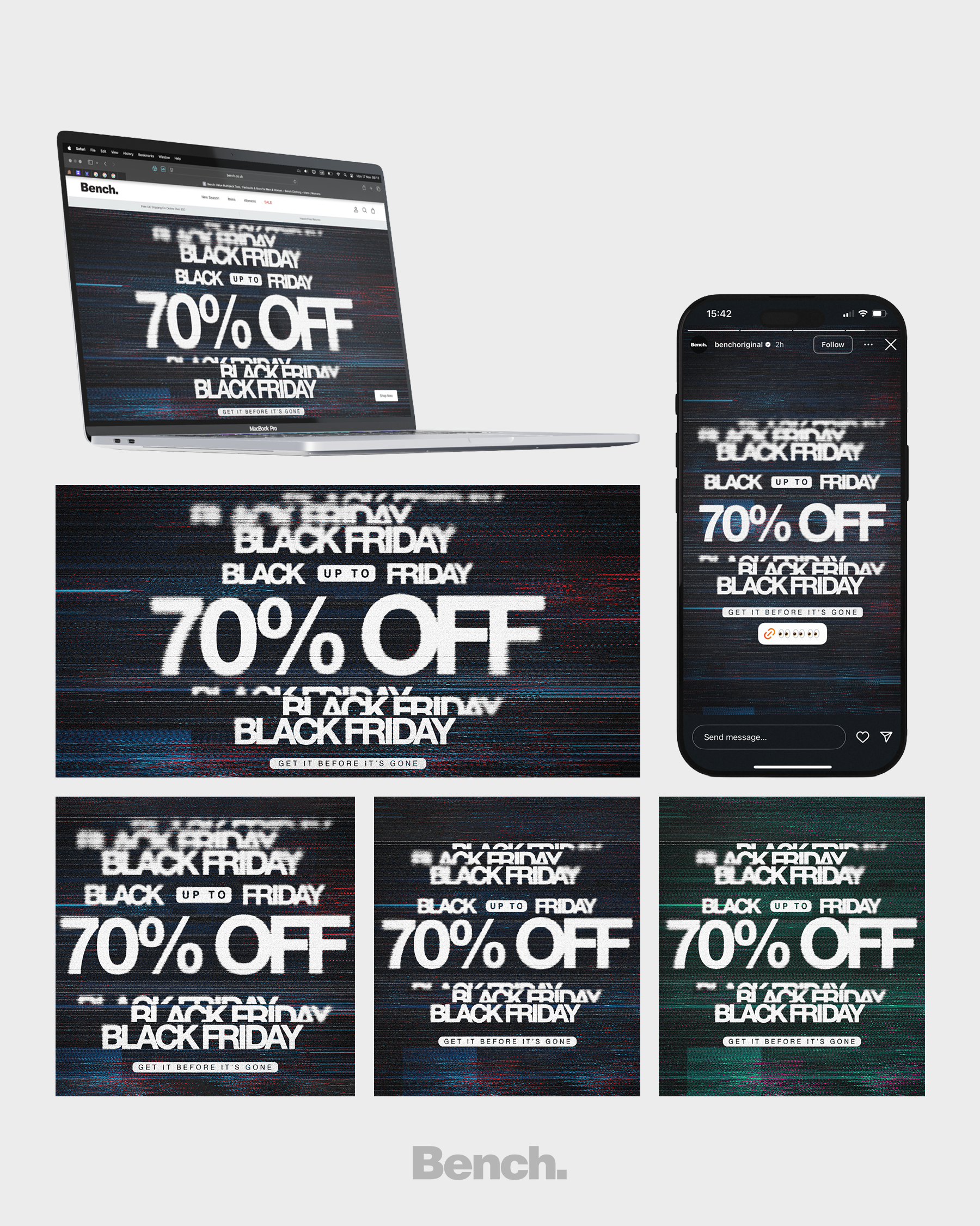 We were approached to design promotional assets for Bench’s Black Friday and Cyber Monday campaign, creating digital visuals to communicate key discount offers.